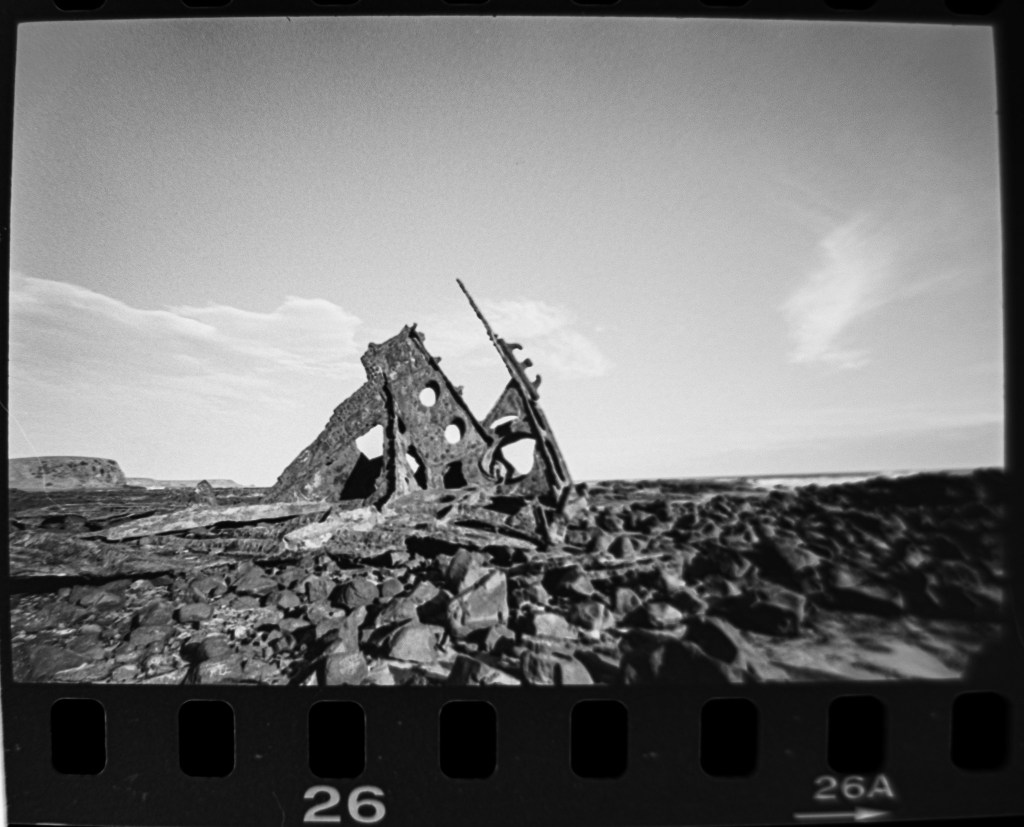 I carried the camera around for a couple of weeks. During a photography workshop at the wreck of the SS Speke here on Phillip Island, Australia, I pulled out the Fujica and took a few shots. The SS Speke was the biggest three masted steel ship in the world when it ran into the reef here at Kitty Miller Bay. I finished off my roll of film at the wreck then developed it at home in Rodinal. My Epson c550 scanner was not working and I ended up scanning the negs with my Fujifilm digital camera. I left the scan uncropped because I liked the rough frame esthetic for this shot.